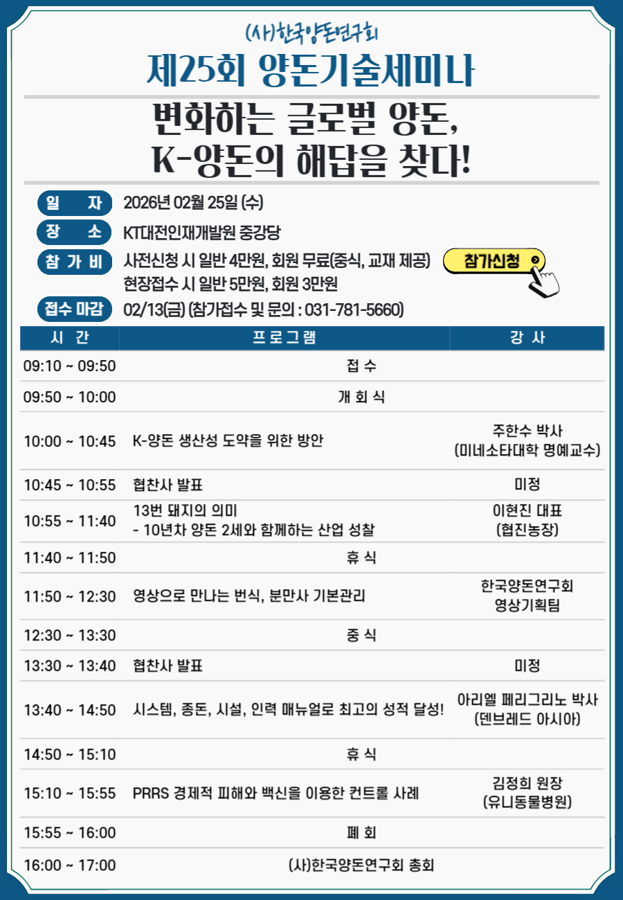 제25회 양돈기술세미나 및 정기총회 개최 안내 !!!